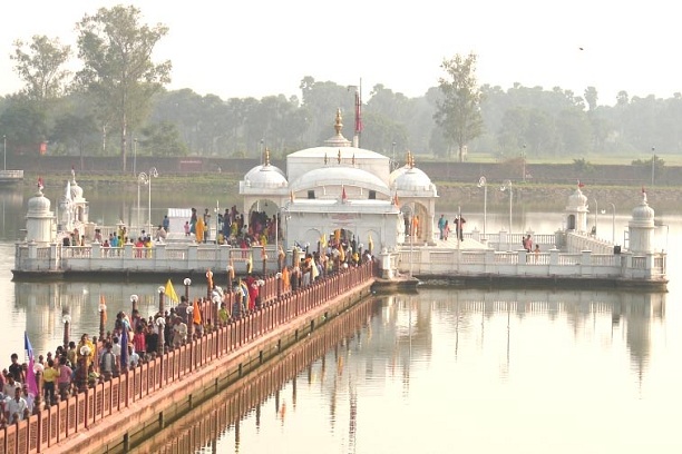 Jal Mandir is built in white marble within the water tank; the tank measures 16.8 acres. The water surface of the lake is covered with lotuses. This architecturally elegant temple in the form of a “Vimana” or chariot has the footprint of Mahavira for worship. A 600 feet (180 m) long bridge built in stone connects the temple with the bank of the water tank. The temple shines bright and sublime during a moonlit night. The pond has many species of fish which are fed by the priests and devotees.